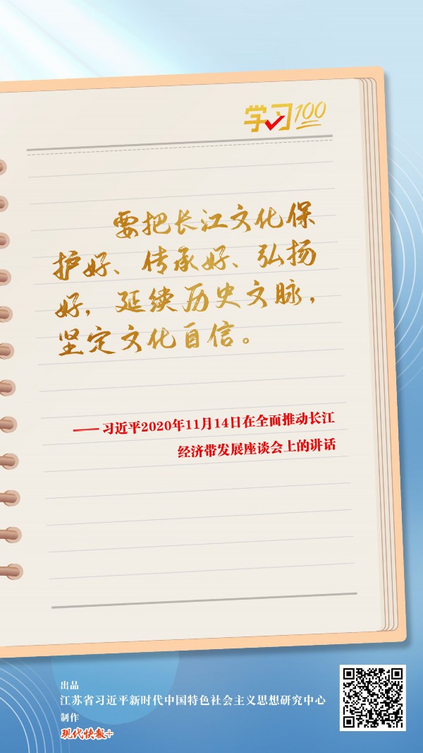 长江造就了从巴山蜀水到江南水乡的千年文脉,是中华民族的代表性符号和中华文明的标志性象征,是涵养社会主义核心价值观的重要源泉。要把长江文化保护好、传承好、弘扬好,延续历史文脉,坚定文化自信。
