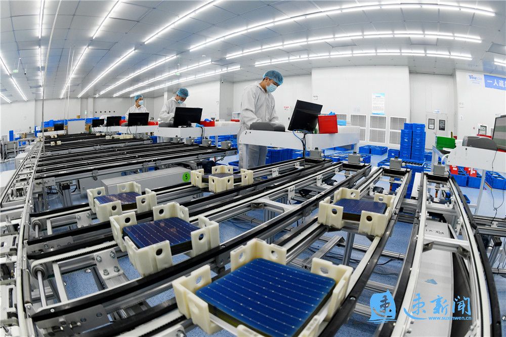 近日,记者走进天合光能(宿迁)光电有限公司生产车间,一辆辆AGV运输车如精灵般在车间来回穿梭,一架架机器人手臂有条不紊地进行着装配作业,一套套业内技术领先的太阳能光伏组件产品经过自动玻璃上料、高速智能串焊等工序生产下线……现场一派热火朝天的生产景象。