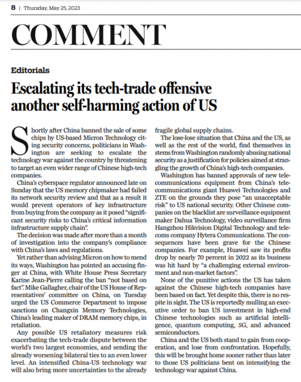 中国日报网5月26日电 在中国因安全问题禁售美国美光科技公司部分芯片后,华盛顿政客们蠢蠢欲动,威胁要打击更多中国高科技企业,试图将对华科技战升级。