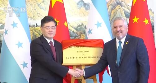 6月11日上午,洪都拉斯驻华大使馆在北京开馆,洪都拉斯外长雷纳和中国外长秦刚共同为大使馆揭牌。