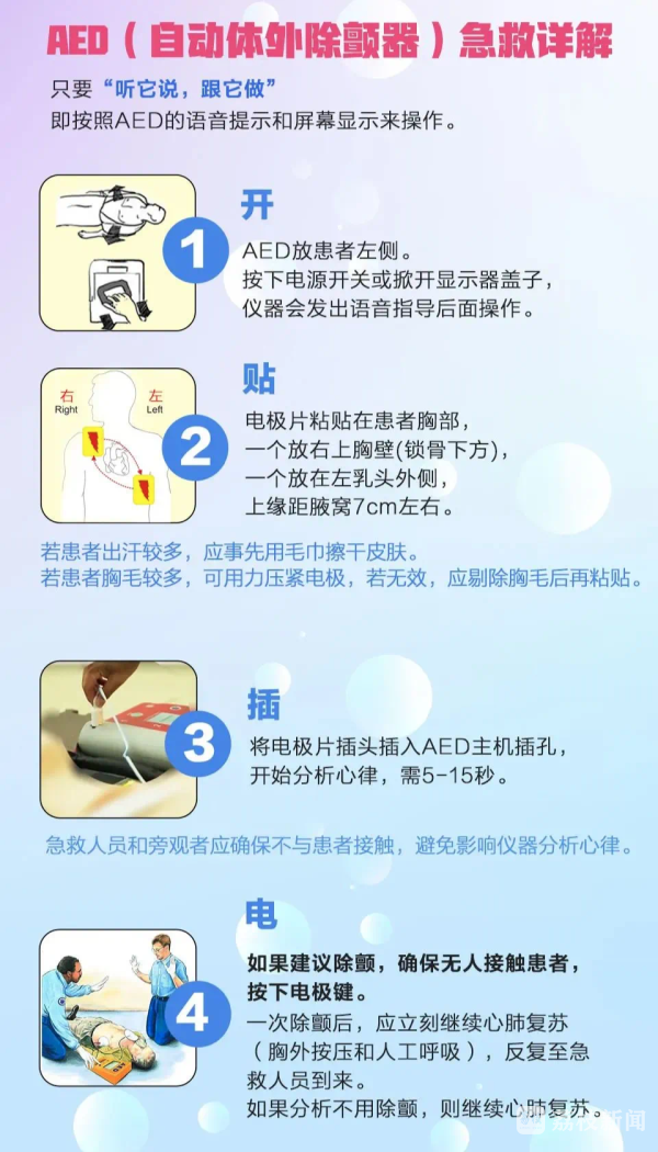 如遇病人突发情况,AED又该如何操作使用呢?请记住“开、贴、插、电”四字口诀↓↓↓