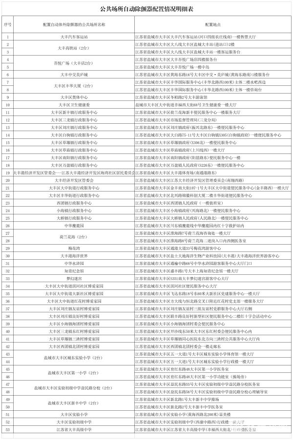 至此,大丰区46个公共场所累计配备AED将达55台,其中53台已安装到位,市民可通过“我的盐城”APP搜索最近AED位置。具体配置位置见下表: