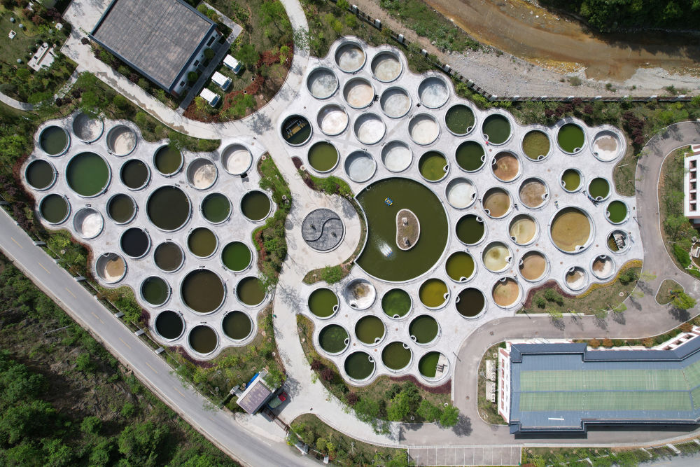 这是黄金峡水利枢纽工程配套建设的鱼类增殖放流站(2022年4月19日摄,无人机照片)。新华社记者 邵瑞 摄