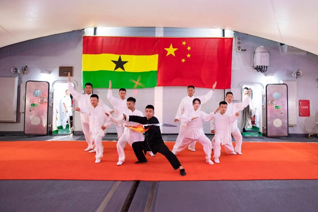 7月1日,中国海军第43批护航编队圆满结束对加纳的友好访问,离开加纳特马港。这是访问期间,中国编队在南宁舰举行甲板招待会,编队官兵表演武术。新华社发(吴亢慈摄)