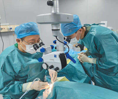 北京大学人民医院主任医师曹晓光(左)与一名乌兹别克斯坦医师共同为当地患者进行白内障手术。