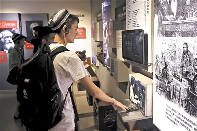 2023年7月14日,参加上海合作组织成员国青少年夏令营暨“上合小记者”系列活动的青年在中国传媒大学博物馆体验摩尔斯码互动装置。