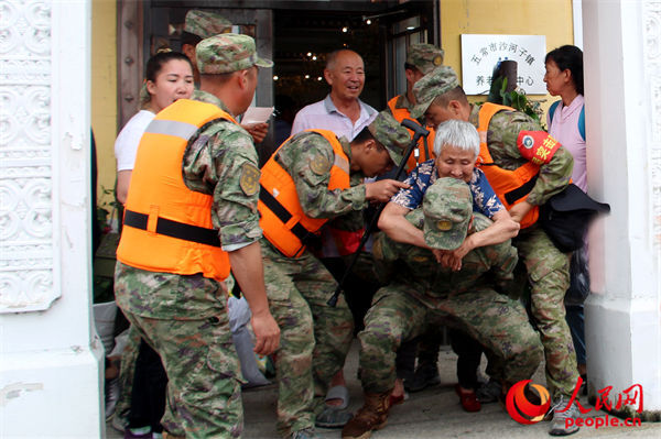在该镇敬老院,47名行动不便的老人正在楼上“望水兴叹”。当看见官兵来了,大家纷纷竖起大拇指。官兵背上老人,小心翼翼地蹚着齐膝深水一步步走出镇子、走向安全地域。一位老大爷激动地说:“解放军好样的,你们要是不来,我们真不知道该怎么办。”