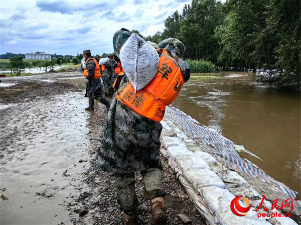 8月5日,第78集团军某旅官兵在齐齐哈尔市碾子山区地域加固岸提。铁彦男摄