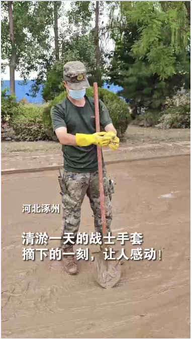 近日,河北涿州,武警官兵在清淤作业中,双手被泡得发白发皱,满是水泡。被问疼不疼,小战士笑着说“不疼”。