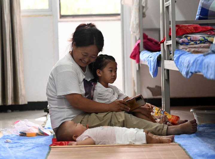 ↑8月12日,在天津市静海区大邱庄中学集中安置点,转移群众在宿舍内照看孩子。