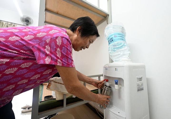 ↑8月12日,在天津市静海区大邱庄中学集中安置点,老人在宿舍内用饮水机取水。
