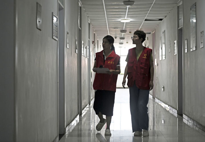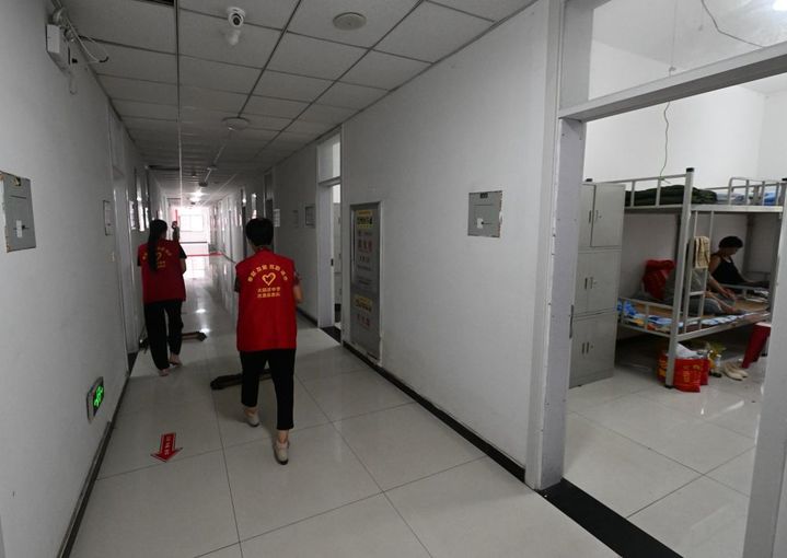 ↑8月12日,在天津市静海区大邱庄中学集中安置点,志愿者在楼道内巡查。