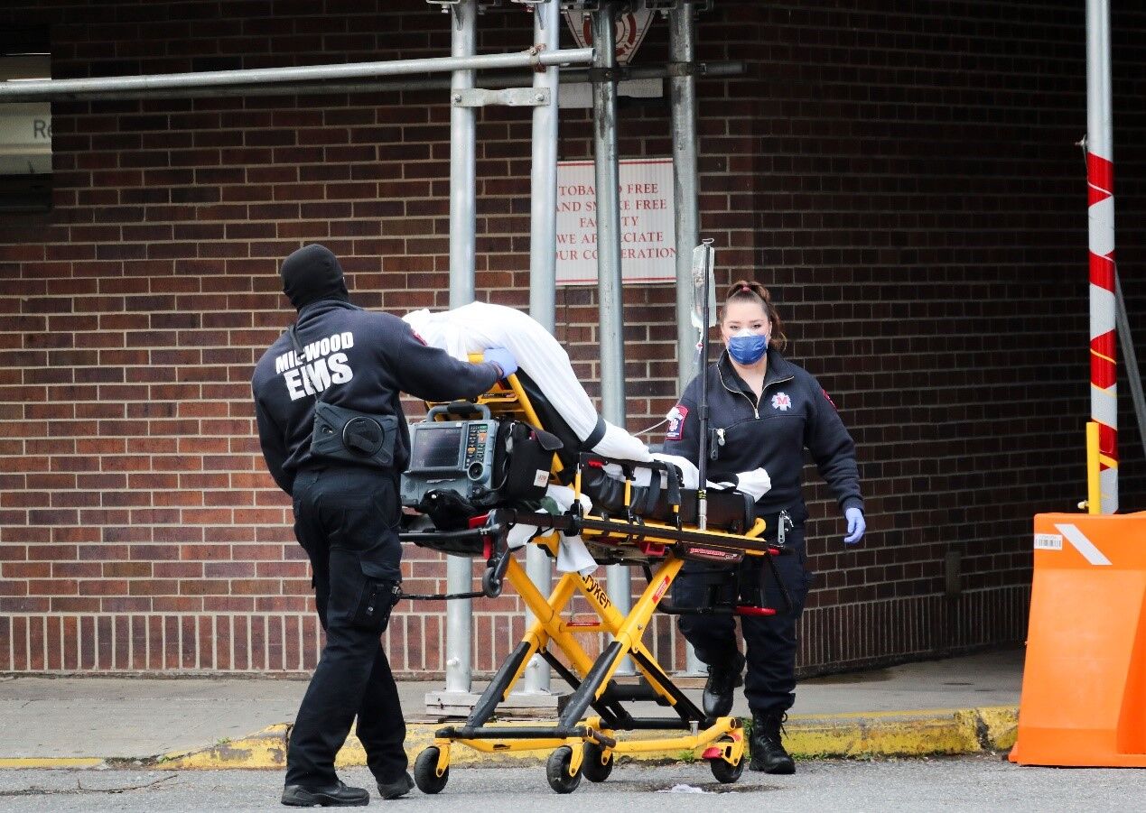 Healthcare workers wheel a patient into Brooklyn Hospital Center in Brooklyn of New York, the United States, on May 11, 2020. (Xinhua/Wang Ying)