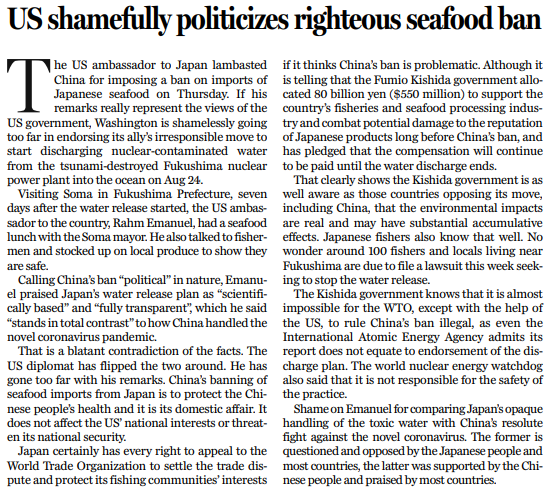 在日本启动核污染水排海一周后,美国驻日本大使伊曼纽尔专程前往福岛县相马市,与市长共进海鲜午餐,并购买了农产品,妄图以此证明当地产品是安全的。更加令人匪夷所思的是,伊曼纽尔称中国暂停进口日本水产品是出于政治考量。与此同时,他对日本的核污染水排放计划大加赞赏,称其有科学依据、完全透明。