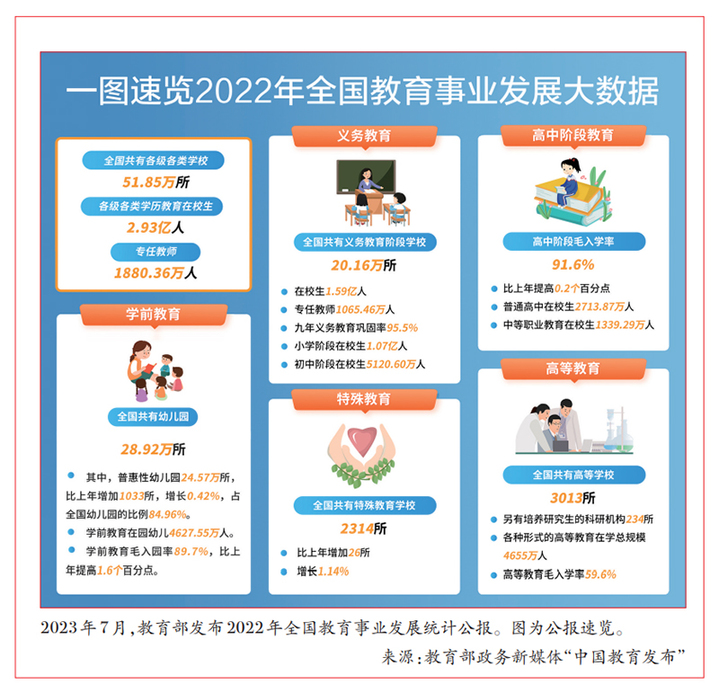 在《扎实推动教育强国建设》这篇重要文章中,习近平总书记明确指出当前“我国教育已由规模扩张阶段转向高质量发展阶段”,强调要“坚持把高质量发展作为各级各类教育的生命线,加快建设高质量教育体系,以教育高质量发展赋能经济社会可持续发展”。一方面,建设教育强国,基点在基础教育。总书记强调,“要推进学前教育普及普惠安全优质发展,推动义务教育优质均衡发展和城乡一体化”;“基础教育既要夯实学生的知识基础,也要激发学生崇尚科学、探索未知的兴趣,培养其探索性、创新性思维品质”;“在全社会树立科学的人才观、成才观、教育观,加快扭转教育功利化倾向,形成健康的教育环境和生态”。另一方面,建设教育强国,龙头是高等教育。总书记强调,“要把加快建设中国特色、世界一流的大学和优势学科作为重中之重,大力加强基础学科、新兴学科、交叉学科建设,瞄准世界科技前沿和国家重大战略需求推进科研创新,不断提升原始创新能力和人才培养质量”。总书记同时指出,“要建设全民终身学习的学习型社会、学习型大国,促进人人皆学、处处能学、时时可学,不断提高国民受教育程度,全面提升人力资源开发水平,促进人的全面发展”。