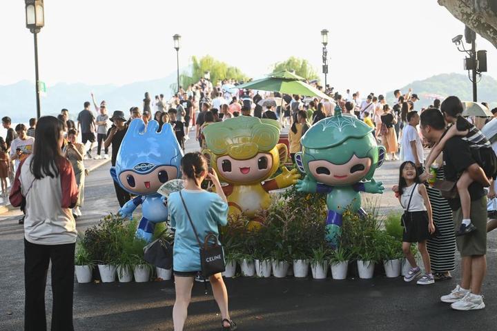 游客在位于杭州西湖景区的断桥边与杭州亚运会吉祥物合影。新华社记者黄宗治摄