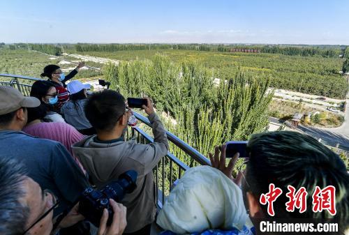 图为港澳台和东南亚华文新媒体编辑、记者登上阿克苏柯柯牙纪念馆的观光塔俯瞰、拍摄如今的柯柯牙。 中新网记者 刘新 摄