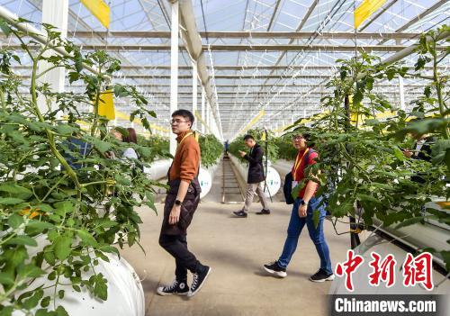 图为港澳台和东南亚华文新媒体采访团观摩新疆疏勒县水发现代蔬菜产业园。 中新网记者 刘新 摄