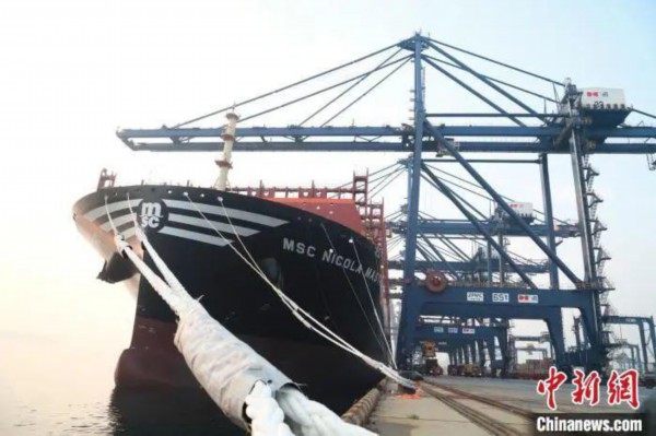 2023年6月24日,全球最大集装箱船“地中海尼古拉马斯特罗”轮靠泊大连港集装箱码头。赵玉昕 摄