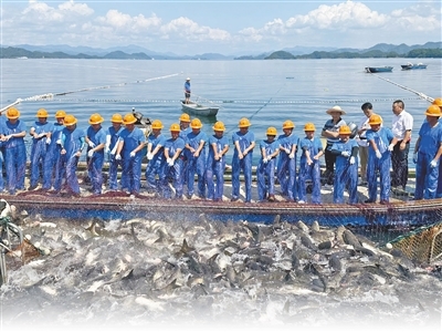 浙江省杭州市千岛湖,捕捞队员合力拉网、喜获丰收。