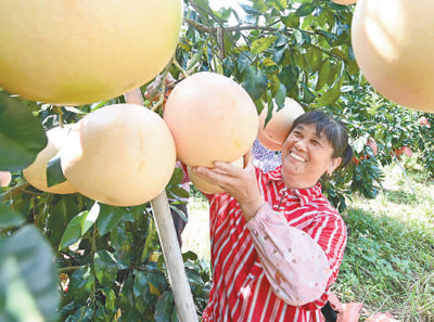江西省赣州市宁都县赖村镇洪源示范种植基地,农户在采摘富硒红柚。