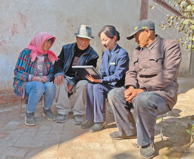 甘肃省张掖市甘州区明永镇上崖村,张掖农商银行工作人员在指导玉米制种农户进行线上申请贷款业务。