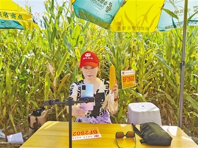 甘肃省张掖市甘州区大满镇大沟农场,电商主播在线推介玉米新品种。