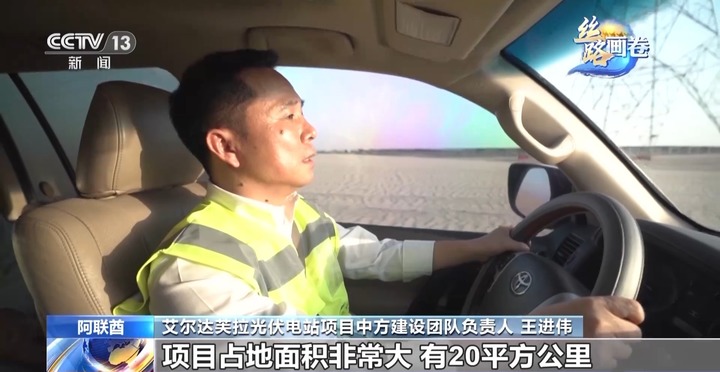 艾尔达芙拉光伏电站项目中方建设团队负责人 王进伟:项目占地面积非常大,有20平方公里,相当于2800个足球场的大小,所有的电缆加起来超过16000公里。
