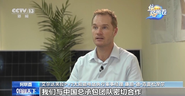 艾尔达芙拉PV2太阳能电站执行董事经理 康坦·德·克雷松涅尔:我们与中国总承包团队密切合作,一天内就能安装37000块太阳能光伏板。这个项目也代表着阿联酋朝着实现2050年净零排放目标启程。